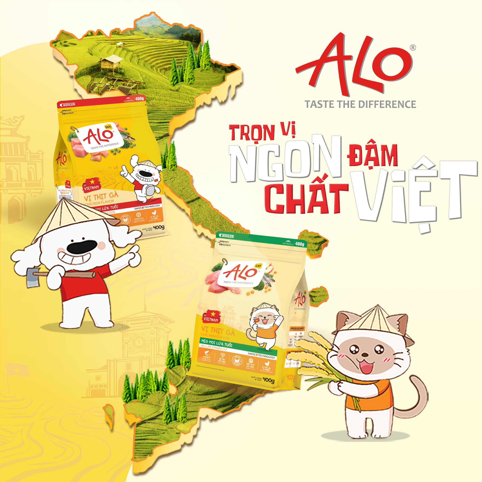 ALO tự hào là sản phẩm được sản xuất 100% tại Việt Nam với nguồn nguyên liệu tươi ngon từ các vùng miền, một sản phẩm chất lượng cao được tạo nên từ tình yêu của cô mèo Lala và chú chó Lolo, mang đến những bữa ăn thuần Việt, giàu đạm và tự nhiên cho thú cưng.