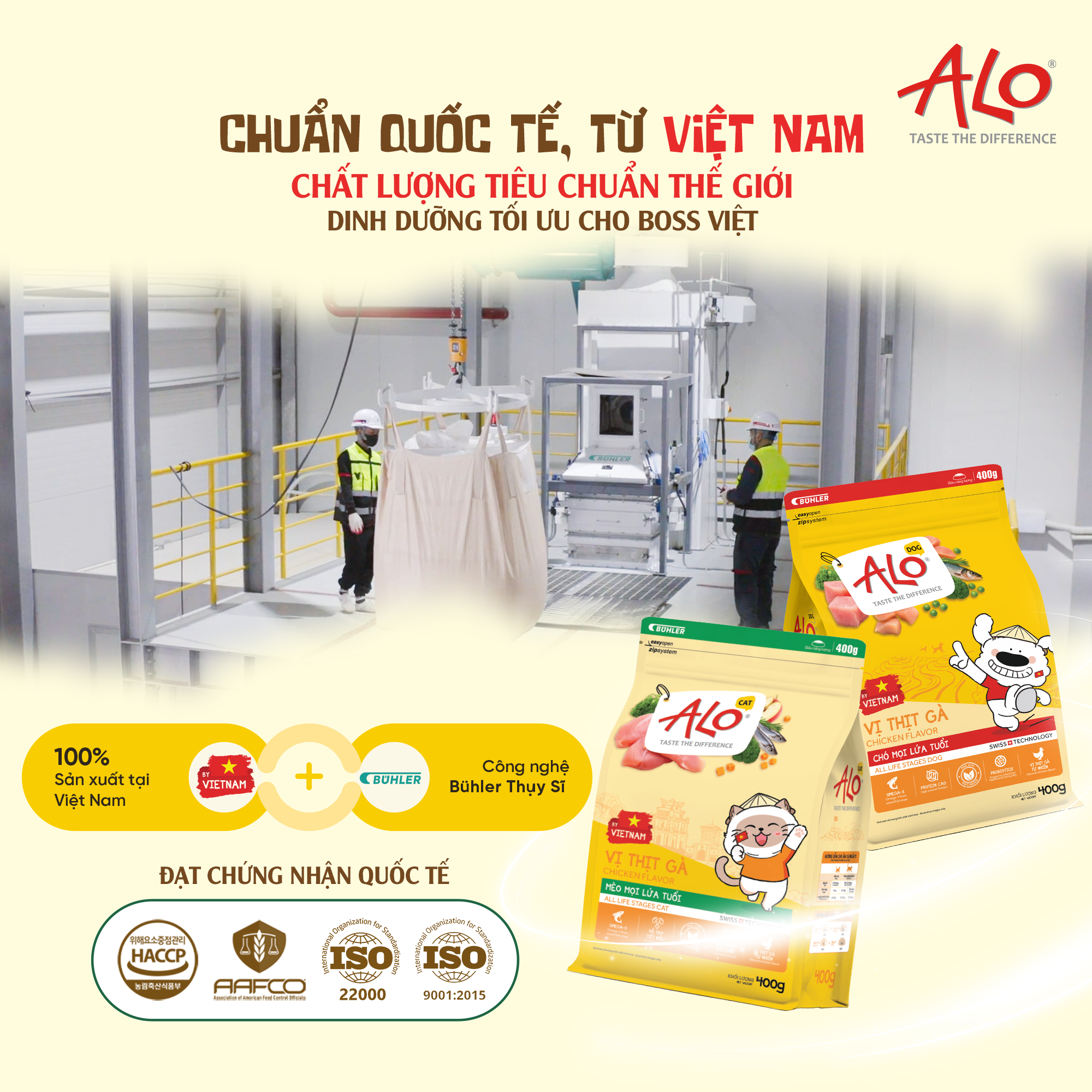 ALO tự hào mang đến Chất Lượng Quốc Tế Đến Từ Việt Nam. Mặc dù 100% sản phẩm được sản xuất tại Việt Nam, quy trình sản xuất của Fusion Group áp dụng Công Nghệ Bühler đến từ Thụy Sĩ, đảm bảo tiêu chuẩn khắt khe về an toàn và dinh dưỡng toàn cầu.